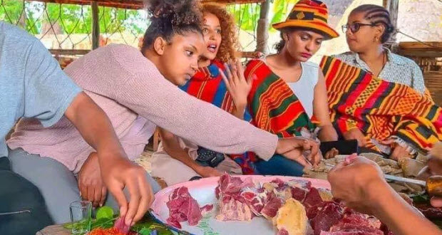 يأكل الأثيوبيين اللحوم النيئة في المناسبات العائلية و الإحتفالية رغم المخاطر الصحية لتلك العادة و يرجع سببها إلي الحرب التي خاضتها البلاد حيث كان يختبأ المقاتلين داخل الجبال و لا يستطيعون إشعال النيران لتجنب كشفهم و هو الأمر الذي كان يضطرهم إلي أكل اللحوم نيئة .