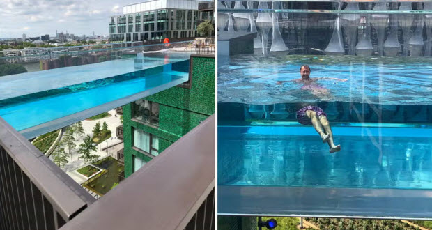 في مدينة لندن يوجد حمام سباحة معلق يطلق عليه إسم سكاي بول و هو يربط بين برجيين سكنيين مكونين من عشرة طوابق علي إرتفاع 30 متر و طوله يصل إلي 14 متر .